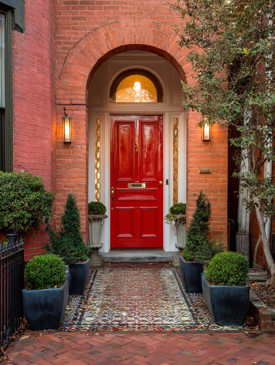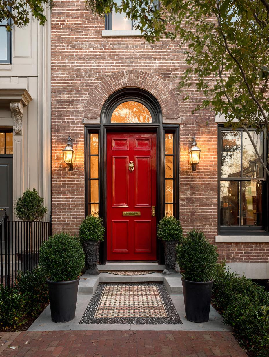 Bold red lacquered double doors command attention beneath a stunning brick archway that frames this traditional entrance. Symmetrical boxwood topiaries in sleek planters create formal balance, while warm lantern sconces cast inviting light across the herringbone brick pathway. White trim details and decorative rope molding add refined contrast against the rich red brick facade, exemplifying timeless Georgian architectural elegance.