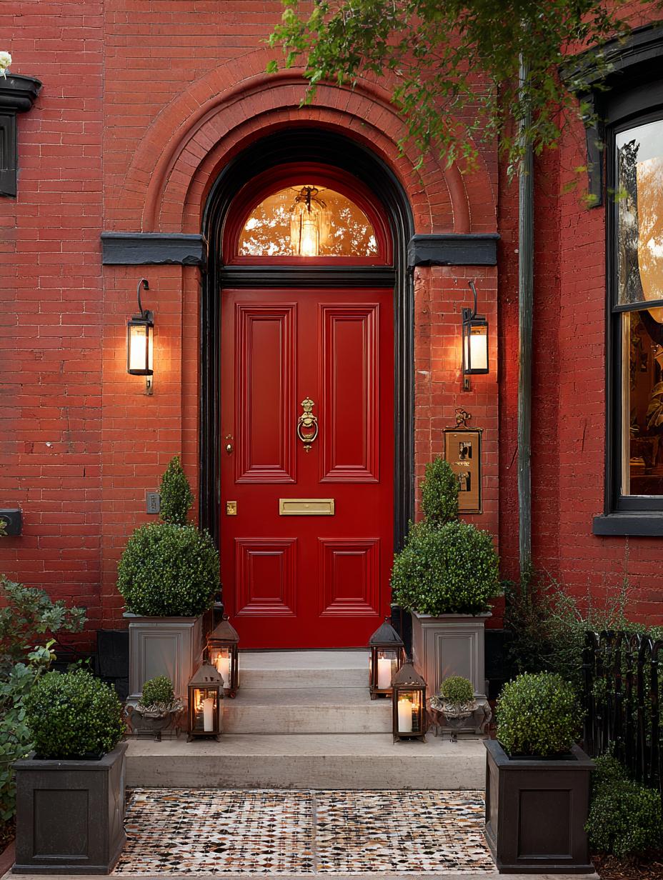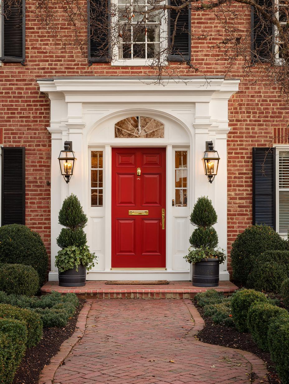 Bold crimson paint transforms this traditional colonial entrance into a welcoming focal point that commands attention. White limestone columns frame the six-panel door beautifully, while brass hardware adds warm metallic accents. Black louvered shutters provide classic contrast against weathered brick walls. Symmetrical boxwood topiaries in dark planters create structured elegance, complemented by flickering gas lanterns that cast inviting shadows across the herringbone brick walkway.