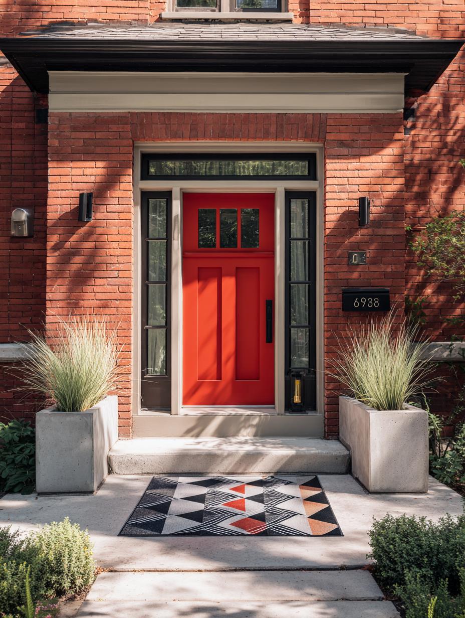 Warm brick creates the perfect backdrop for this vibrant orange-red front door that commands attention from the street. Sleek concrete planters filled with ornamental grasses flank the entrance, while a geometric patterned outdoor rug adds contemporary flair to the clean lines. Black hardware and transom windows complete this striking modern entryway that balances bold color with sophisticated minimalism.