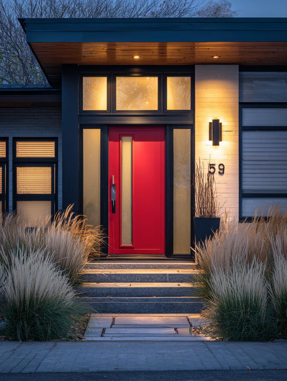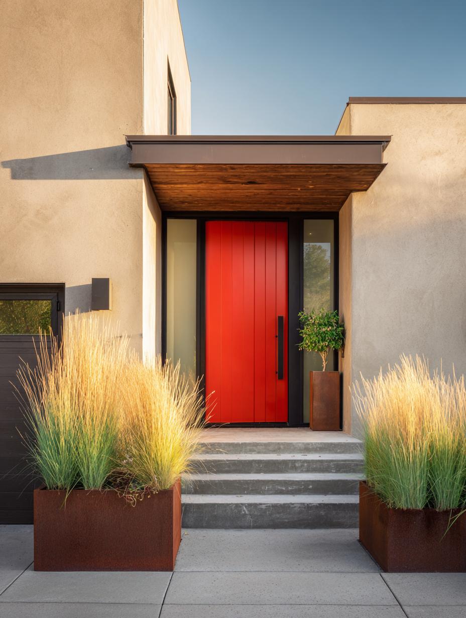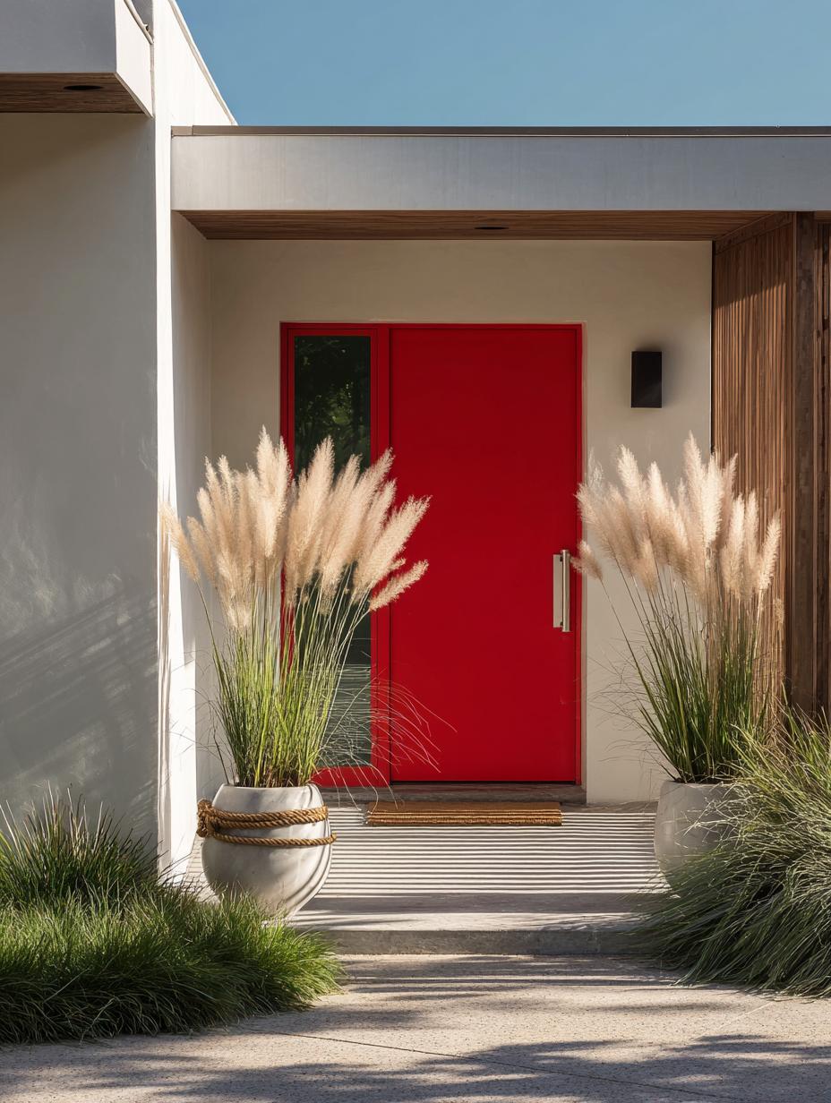 Bold Red Entry with Pampas Grass and Modern Architectural Lines