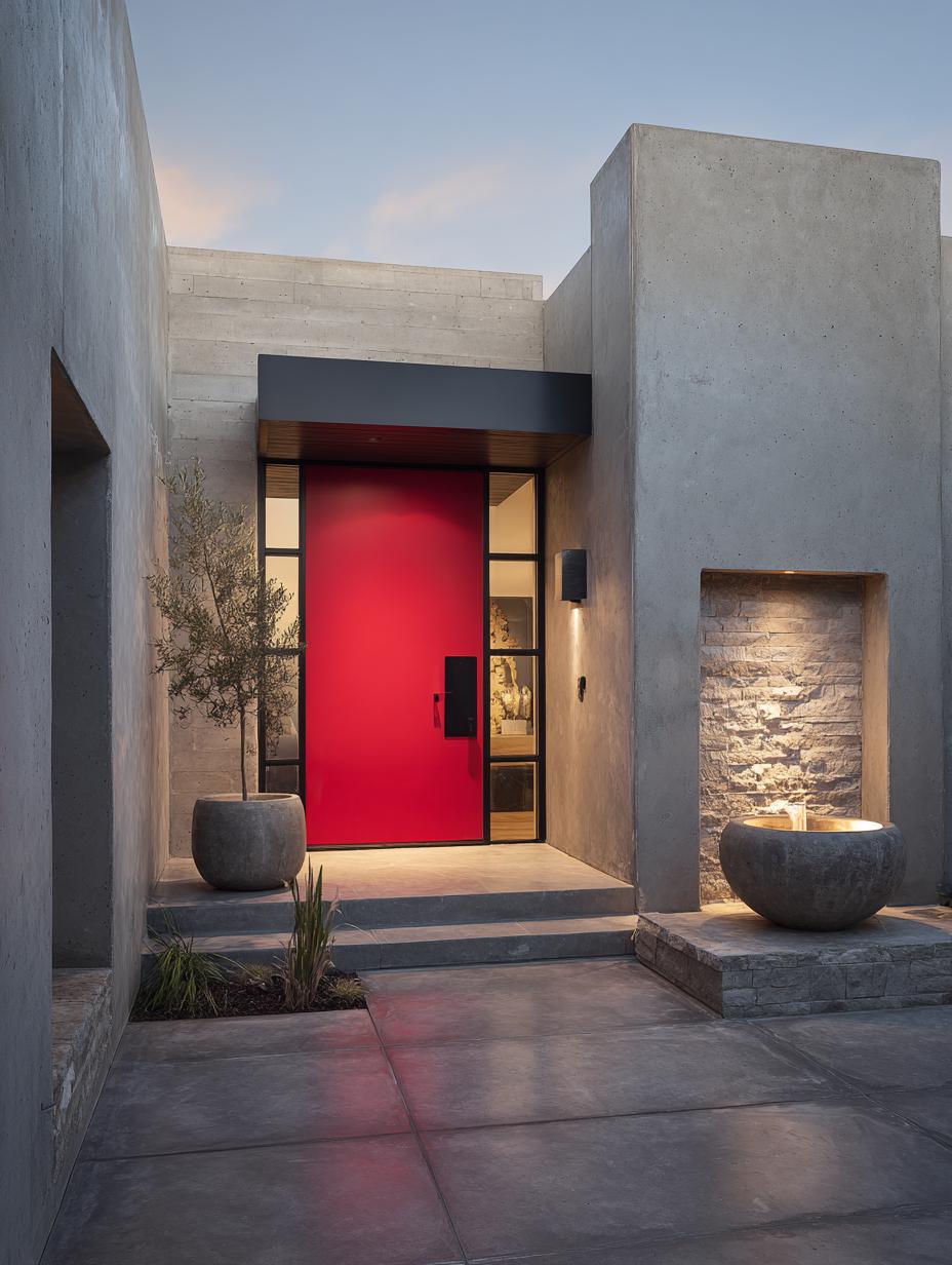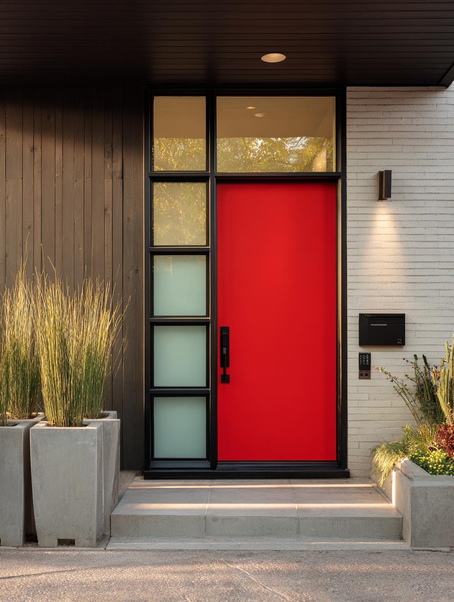 Bold Contemporary Entry with Striking Coral-Red Door and Clean Lines