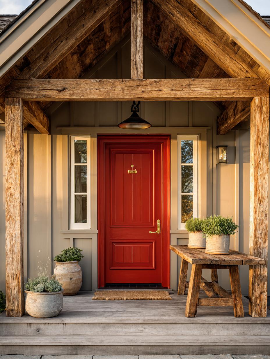 Rustic Stone and Timber Entryway with Bold Crimson Door
