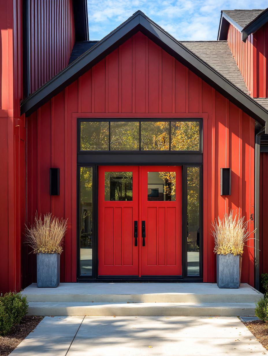 Dramatic red board-and-batten siding creates a striking backdrop for this contemporary farmhouse entrance. Double doors painted in matching crimson establish perfect color harmony while black window trim provides sharp contrast. Concrete steps lead to a welcoming entry flanked by modern planters filled with ornamental grasses, combining rustic charm with clean architectural lines.