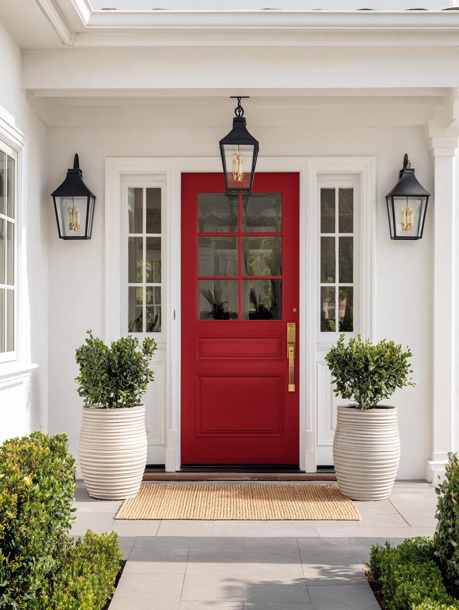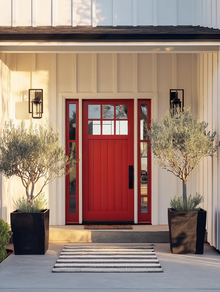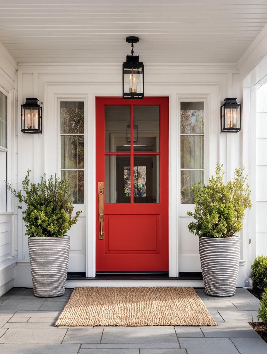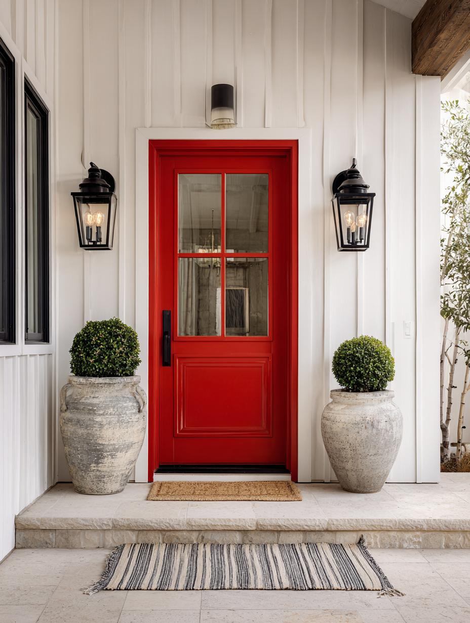 Bold red paint transforms an ordinary entrance into a welcoming focal point against crisp white board-and-batten siding. Black lantern sconces cast warm light while perfectly manicured boxwood topiaries in weathered stone vessels frame the doorway. Natural coir matting and striped woven runners layer texture underfoot, creating an inviting pathway that balances rustic charm with polished elegance for maximum curb appeal.