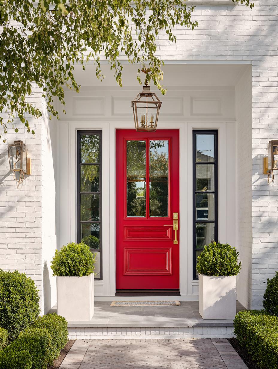 Bold red paint transforms this traditional front door into a stunning focal point against crisp white brick. Brass hardware and a matching lantern overhead add warmth, while geometric glass panels reflect surrounding greenery. Symmetrical white planters filled with perfectly manicured boxwood spheres create elegant balance. Black-framed sidelights enhance the contrast, making this entryway both welcoming and sophisticated for any colonial or transitional home style.
