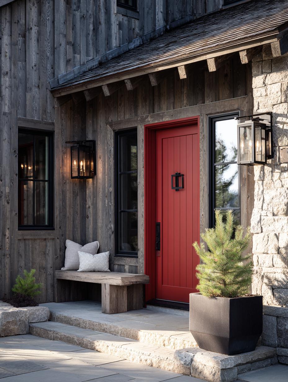 Weathered gray wood siding creates stunning contrast against this vibrant red vertical plank door, while black iron lantern sconces provide warm ambient lighting. Natural stone masonry anchors the design with texture and permanence. A simple reclaimed wood bench offers casual seating beneath the covered porch overhang. Modern black window frames maintain clean lines while honoring the rustic aesthetic. Concrete planters filled with evergreen sprigs add organic elements to this welcoming mountain retreat entrance.
