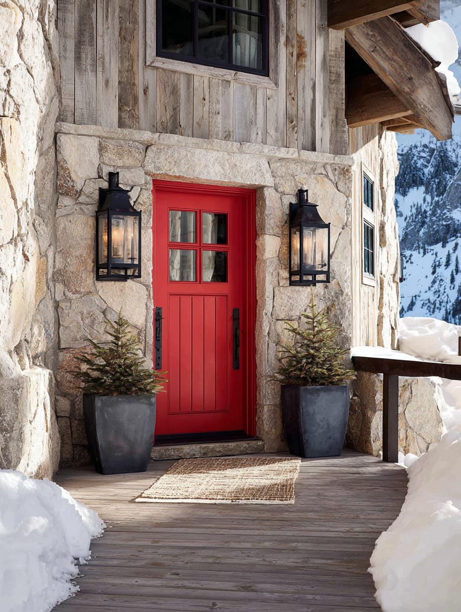 Natural stone walls create a stunning backdrop for this vibrant red farmhouse-style door, perfectly framed by black iron lantern sconces that cast warm welcoming light. Charcoal planters anchor evergreen trees on either side, while weathered wood siding above adds rustic texture. The woven doormat and wooden deck complete this mountain retreat entrance that balances rugged materials with refined styling touches.