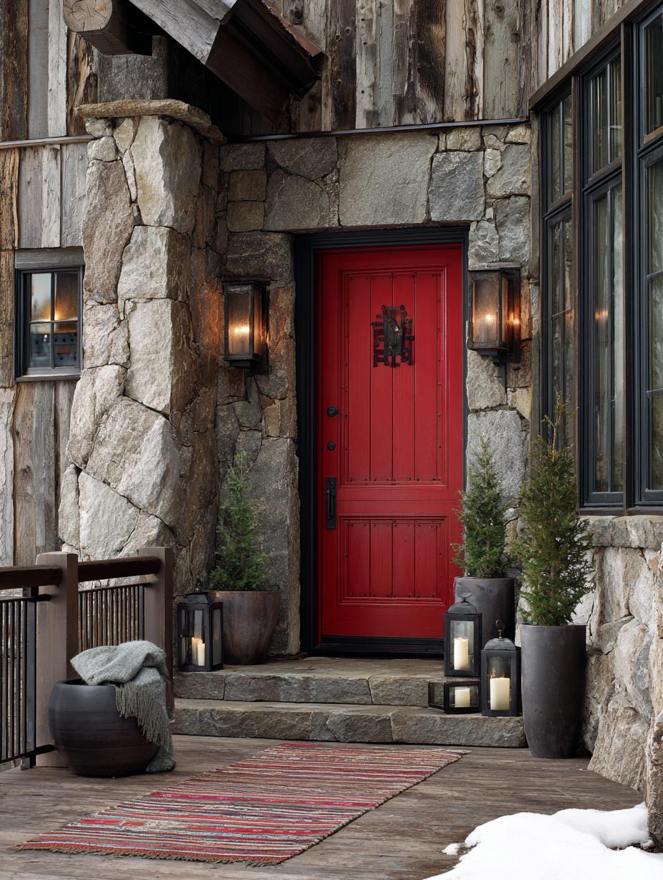 Natural fieldstone walls create a stunning backdrop for this vibrant red planked door, while weathered wood siding adds authentic mountain lodge character. Wrought iron lanterns cast warm ambient light across stone steps, perfectly complementing the striped runner and evergreen plantings. Dark window frames tie together this welcoming entrance that balances rugged materials with refined styling touches.