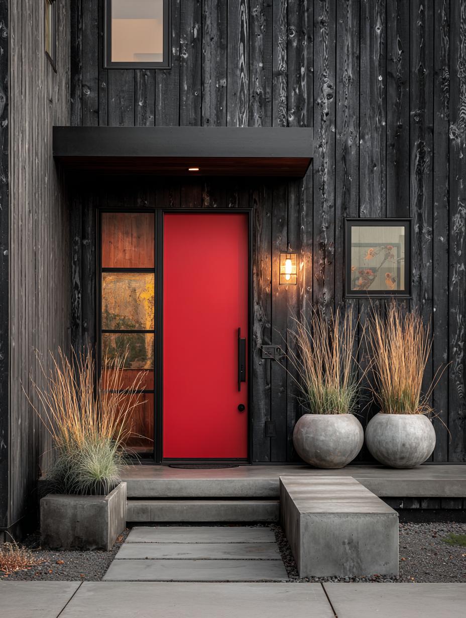 Bold red paint transforms a simple entrance into a striking focal point against dramatic charred wood siding. Concrete planters filled with ornamental grasses create sculptural elements that soften the industrial aesthetic. Warm lighting from a sleek wall sconce illuminates the entry while large windows reveal glimpses of the interior. Clean lines and geometric concrete steps establish a contemporary foundation that perfectly balances the rustic wood texture with modern minimalism.