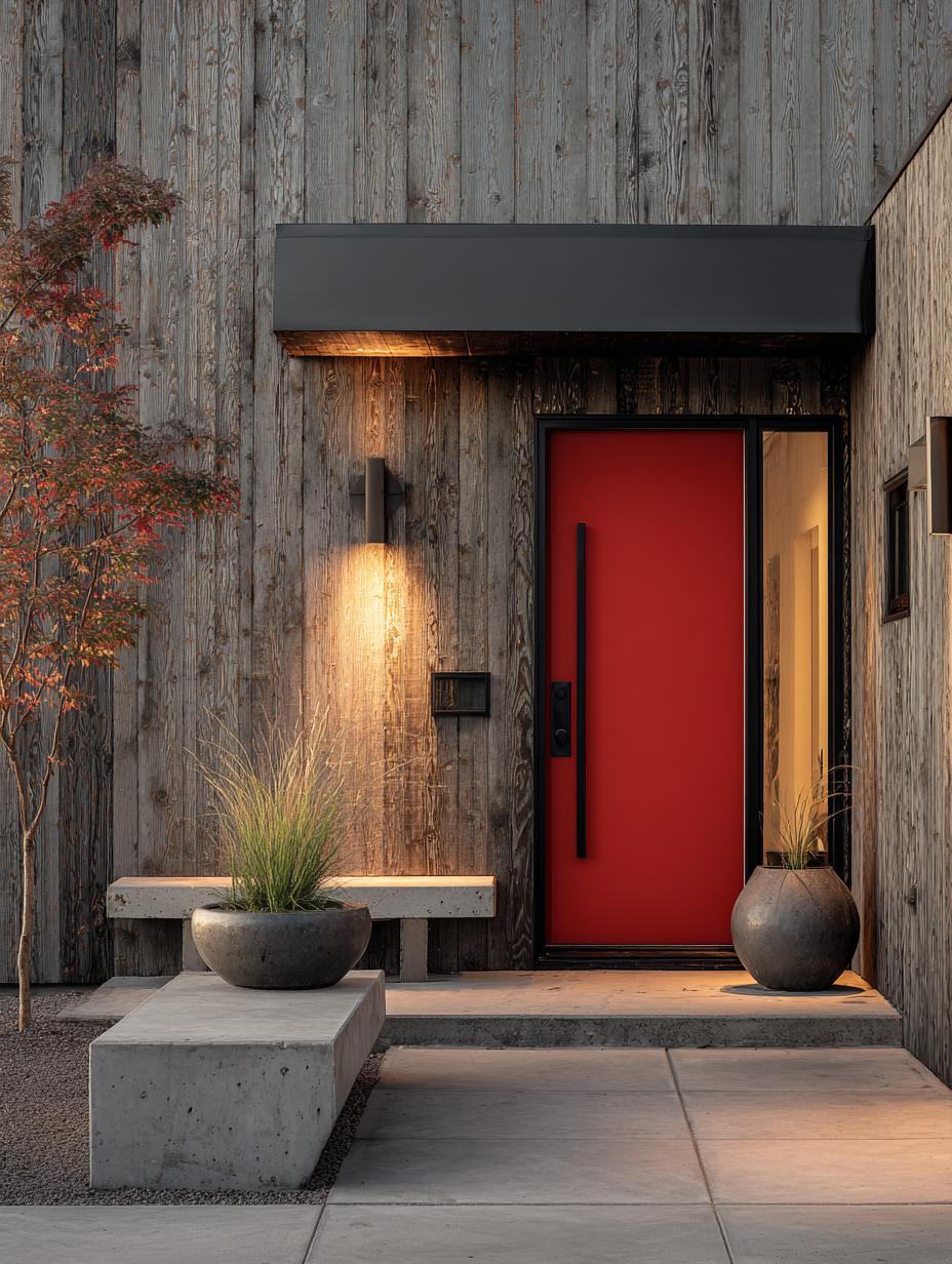 Bold crimson paint transforms an ordinary front door into a stunning focal point against weathered gray wood siding. Modern concrete planters anchor the entrance with sculptural appeal, while strategic outdoor lighting illuminates the textured wood facade. Clean geometric lines from the dark metal overhang contrast beautifully with the rustic siding, creating an inviting contemporary entrance that balances warmth with sophistication.