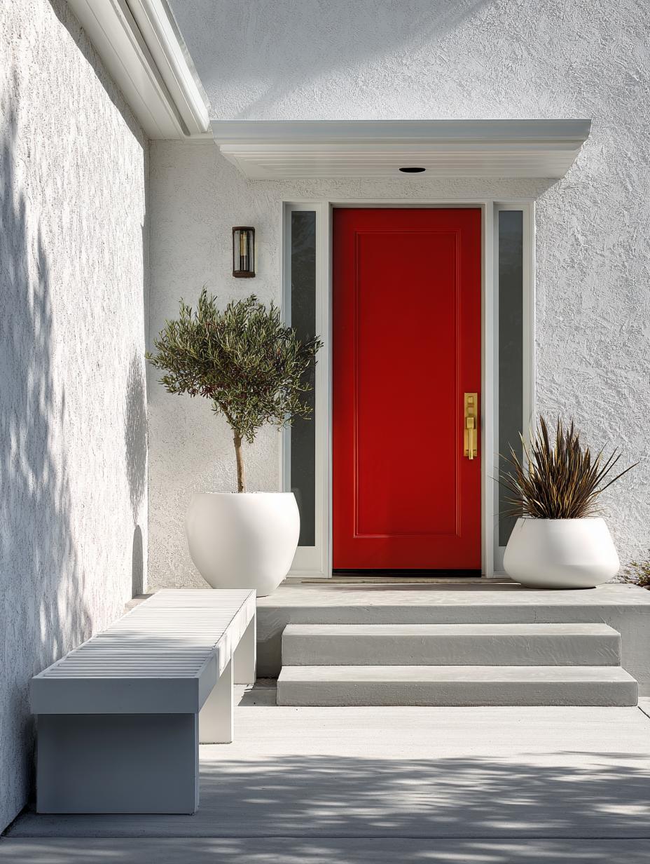 A red front door is a small move with outsized impact. Designers are using it right now as a deliberate focal point, pairing rich red tones with modern hardware, layered porch accessories, and clean architectural lines. The trend isnโt about novelty or tradition. Itโs about confidence. From minimalist slab doors to classic paneled entries, todayโs red front doors are styled with restraint, balance, and just enough surrounding decor to feel intentional, elevated, and unmistakably welcoming.