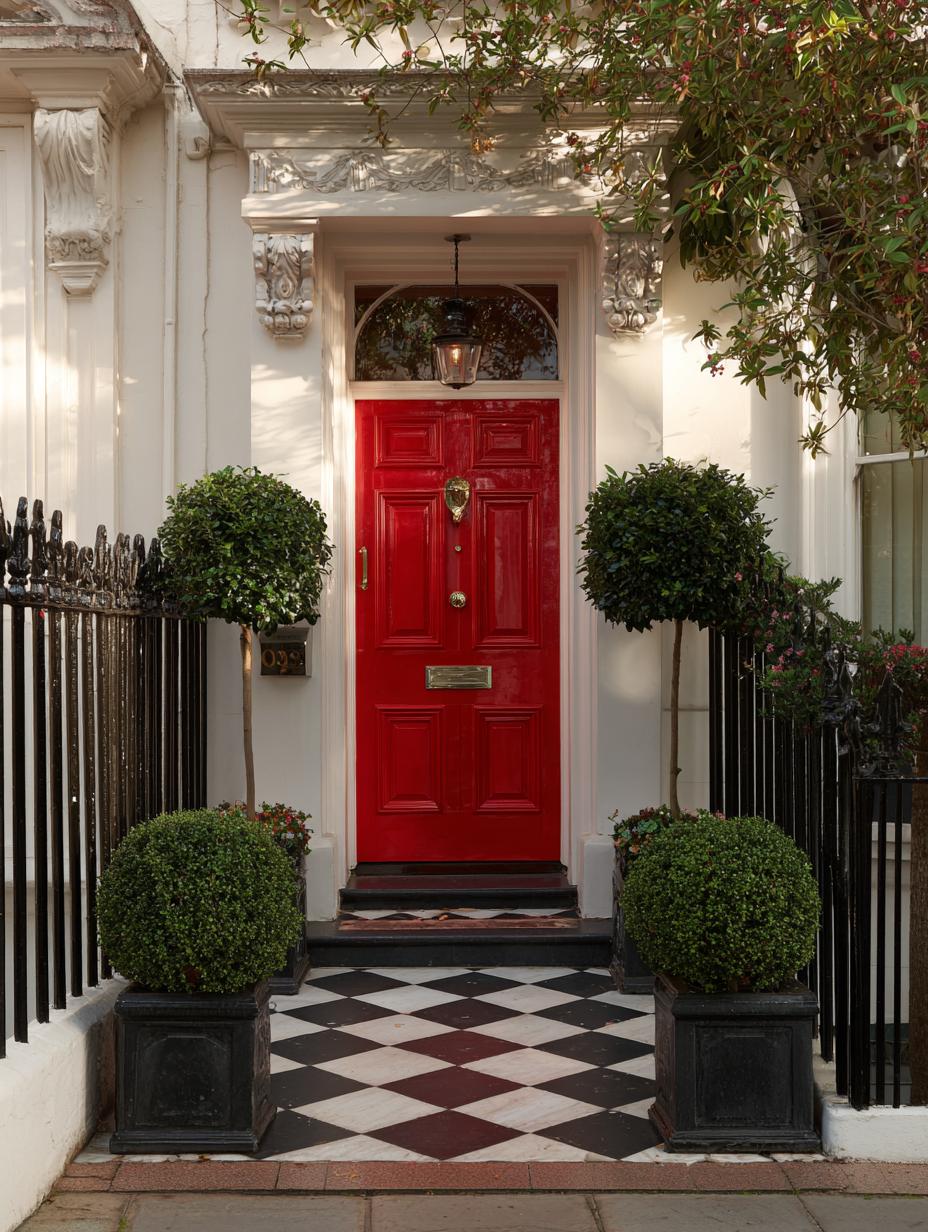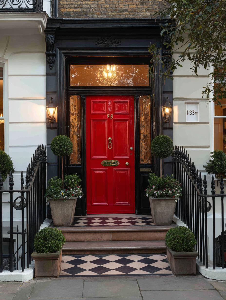 Bold crimson panels create stunning contrast against pristine white classical columns and dentil molding. Symmetrical topiary trees in sleek black planters frame the entrance, while geometric black and white checkered tiles establish sophisticated pattern underfoot. Ornate brass hardware and an arched transom window complete this timeless London-inspired design that transforms any homeโs curb appeal.