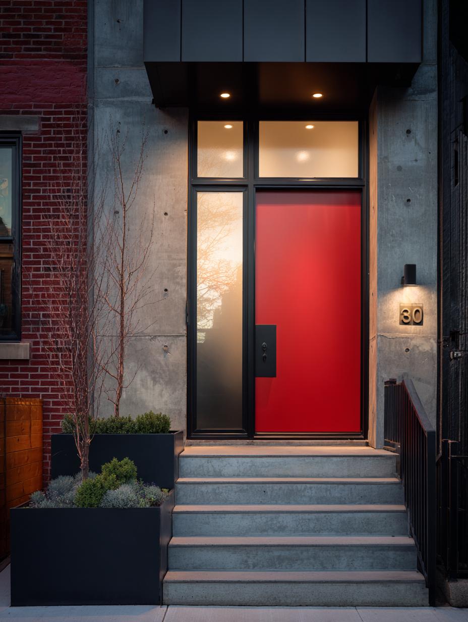 Vibrant red paint transforms this contemporary entrance into a stunning focal point against raw concrete walls. Black metal framing creates crisp geometric lines around expansive glass panels, flooding the entryway with warm interior light. Concrete steps lead visitors up to this architectural statement, while strategic exterior lighting highlights the doorโs bold color choice and modern materials throughout the evening hours.