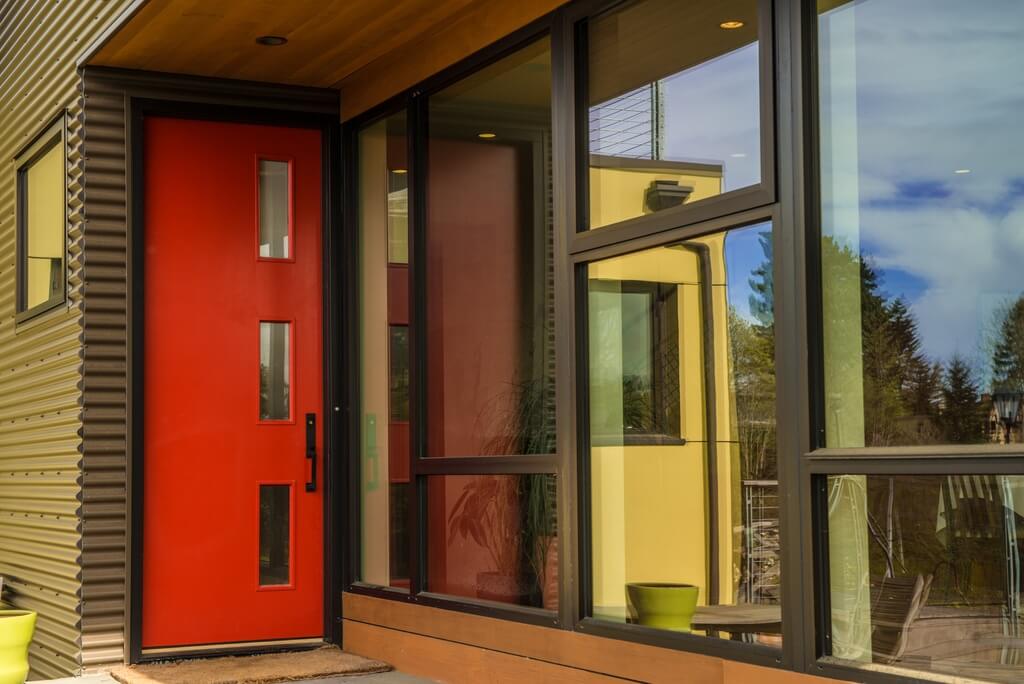 The door to this home is a more modern example, compared to the previous examples you’ve been shown. The left-opening door has three glass panels. The siding of the home is in various materials, including the more industrial aluminum siding on the left and the natural wood above and below the expansive windows. Source: Zillow DigsTM