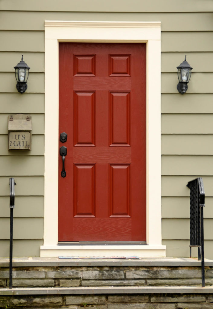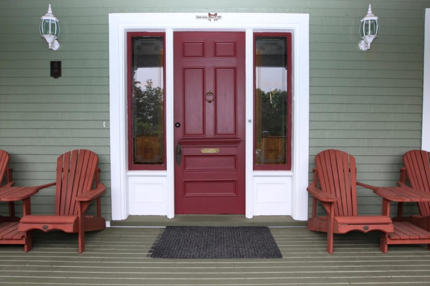 The six-paneled front door above has sidelights of clear rectangular glass on both sides, cased in a burgundy framing. The door also has a bronze doorknocker and a “please come in” plate. The front door is coated with burgundy paint and has bronze locks and a bronze handle. It is wholly supported by a white casing attached to the sage green siding. To the left of the door are brick-red wooden resting chairs and white finished wall lamps.