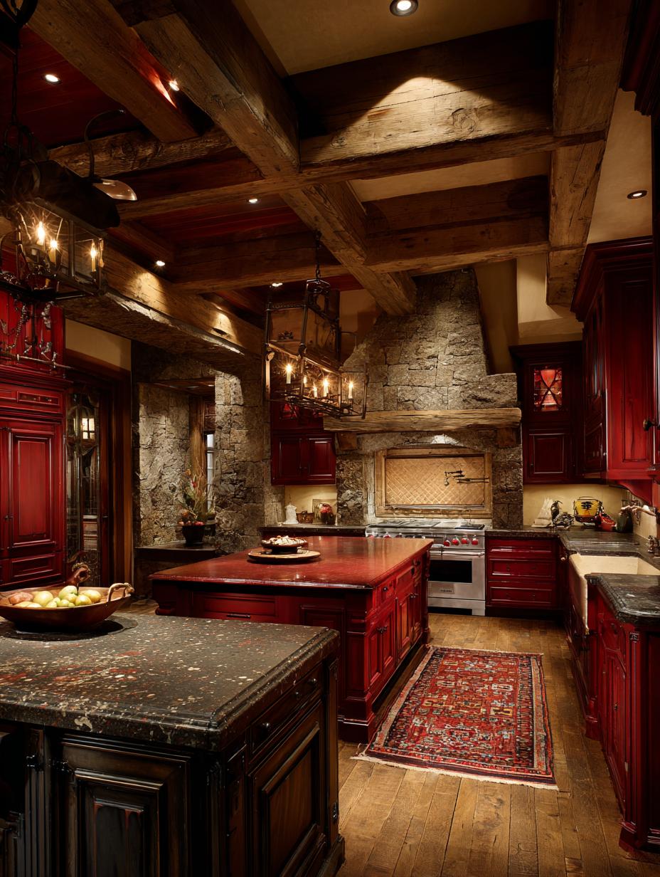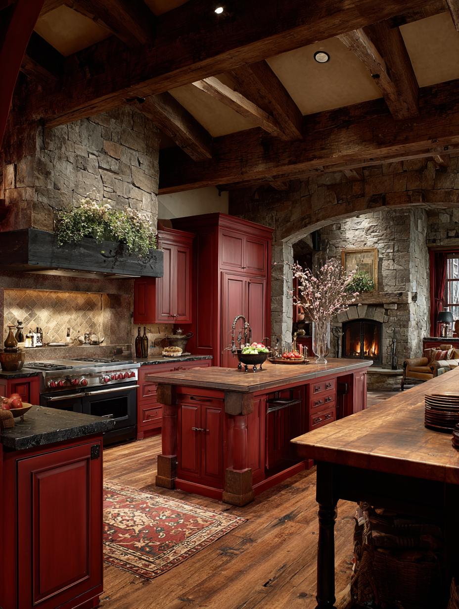 Rustic Stone Hearth Kitchen with Bold Crimson Cabinetry