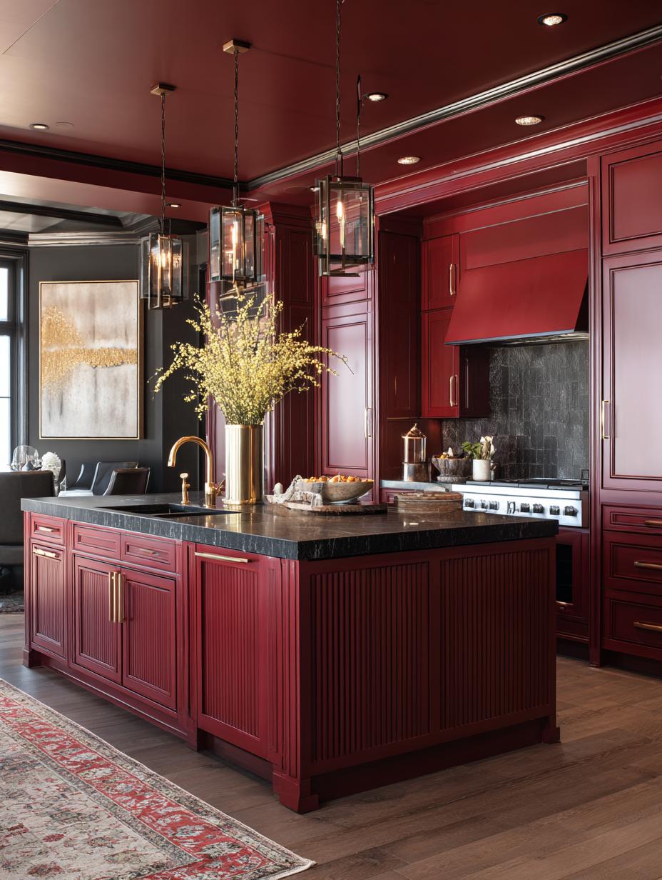 Deep burgundy cabinets paired with dramatic black marble countertops transform this kitchen into a luxurious culinary haven. Glass-front pendant lights suspend elegantly above the expansive island, while brass hardware adds warmth against the rich red finish. The dark slate backsplash creates striking contrast, complemented by traditional Persian rug patterns that soften the bold color palette with sophisticated warmth.