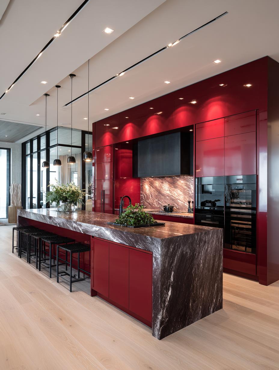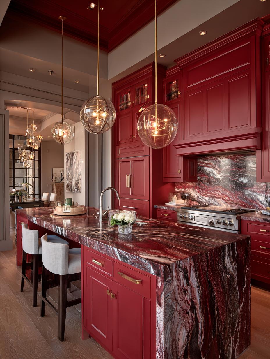 Deep Crimson Cabinets Meet Dramatic Dark Marble in Luxurious Kitchen Design