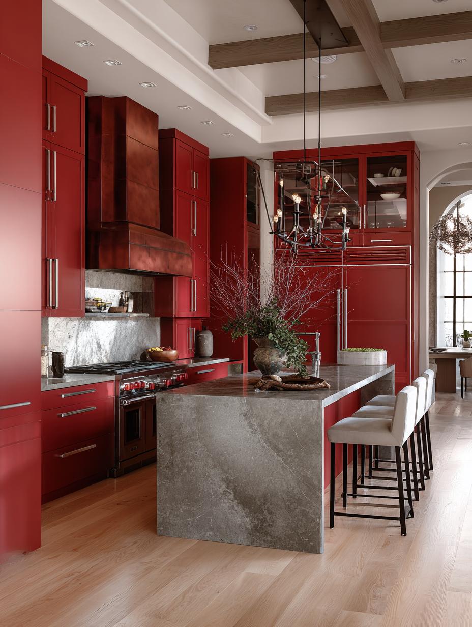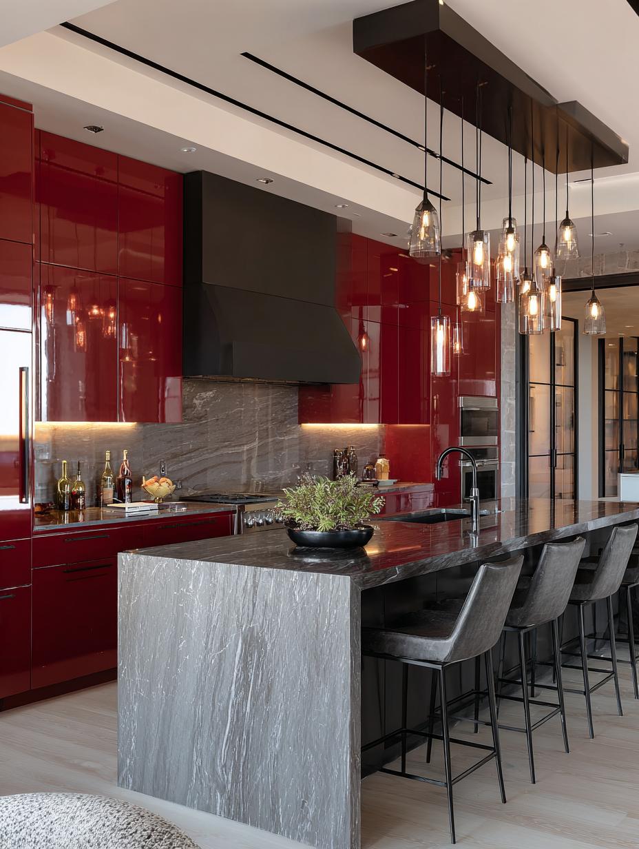 Glossy Cherry Red Cabinets Meet Dark Marble Drama