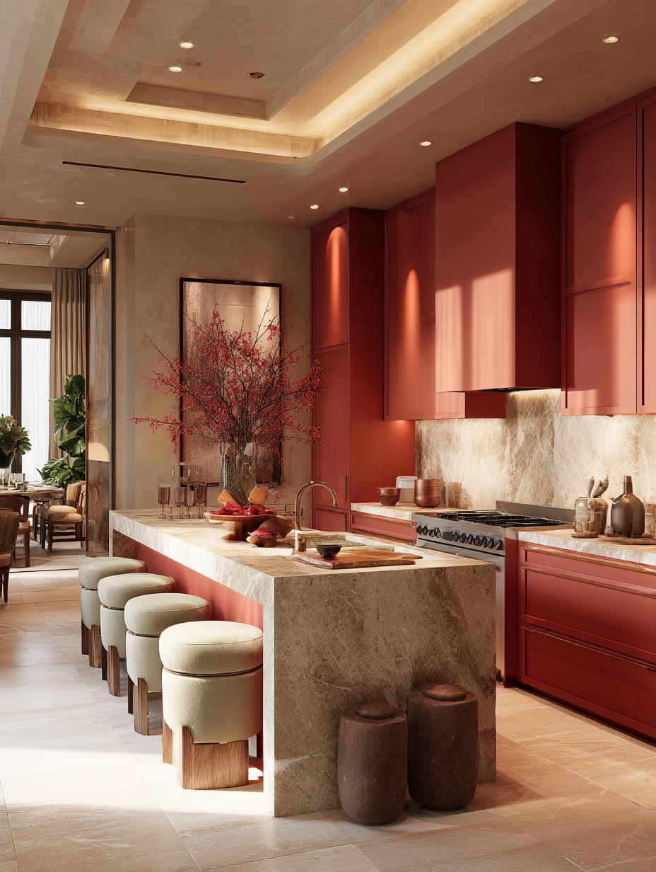 Coral Red Cabinets Meet Dramatic Marble in This Sophisticated Kitchen