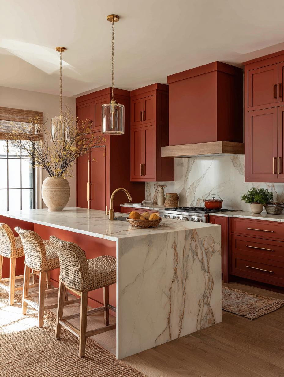 Bold coral-red cabinetry transforms this sophisticated kitchen into a warm, inviting culinary haven. The stunning marble waterfall island creates dramatic visual impact with its book-matched veining, while brass lantern pendants cast golden light across the space. Natural wicker bar stools soften the rich palette, and the marble backsplash extends the luxurious stone treatment throughout the cooking zone.