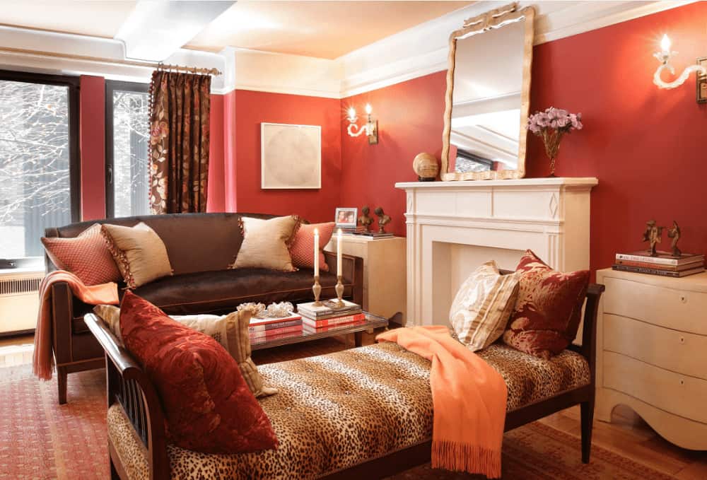 Floors & Walls: This classic beauty of a living room starts with a wood floor that is decorated with a lovely patterned area rug that matches the features of the room perfectly. The specific shade of red paint that has been chosen for the wall is particularly gorgeous. Itโs rusty but still bright, red but rather orange, and it looks even more gorgeous considering the perfect shade of white around the fireplace and ceiling.