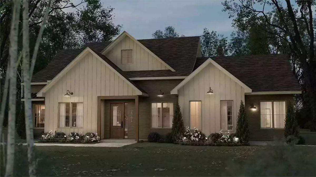 This inviting farmhouse design features classic gabled rooflines, board-and-batten style siding, and warm exterior lighting that gives the home a comfortable, welcoming look from the start. The covered entry creates a natural focal point and adds everyday shelter for coming and going.