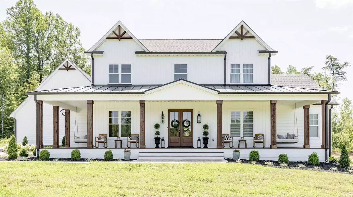 Gray asphalt shingles cap a white exterior with covered patio, fire pit seating, and circular driveway edged by trimmed hedges.