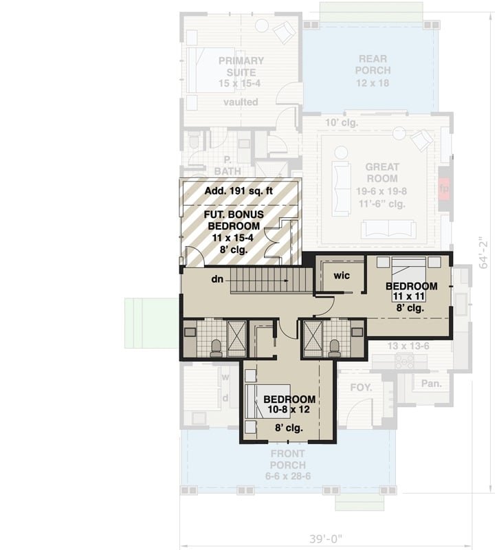 The upper level provides additional bedrooms arranged for privacy, along with shared bath access and walk-in storage. A future bonus bedroom option allows the layout to expand as needs change, making the upper floor flexible for guests, family growth, or workspace use.