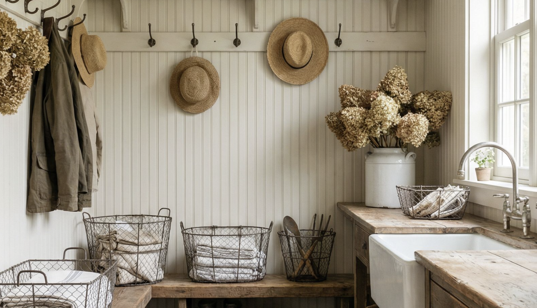 Shiplap paneling creates textural dimension while protecting walls from daily wear. The horizontal lines psychologically widen narrow mudroom corridors, making spaces feel more expansive. Painted in soft whites or warm creams, shiplap backgrounds allow vintage accessories and natural materials to shine as focal points.