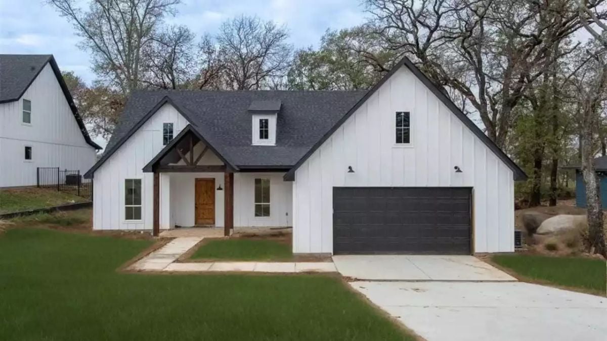 This farmhouse-style home features a crisp exterior with clean gables, vertical siding, and a welcoming covered entry that sets a straightforward, modern tone. The attached garage is integrated into the structure, keeping the overall appearance cohesive and functional.