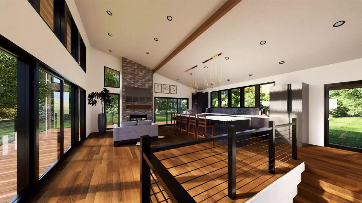 The open floor plan centers on a spacious kitchen with a large island that flows into the great room and dining area, all oriented toward the scenery.