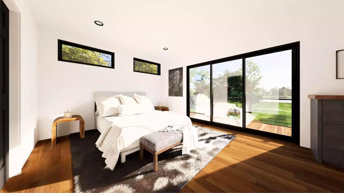 The primary suite offers large windows, direct deck access, and a luxurious ensuite with a soaking tub, walk-in shower, and generous walk-in closet, along with a nearby laundry area.