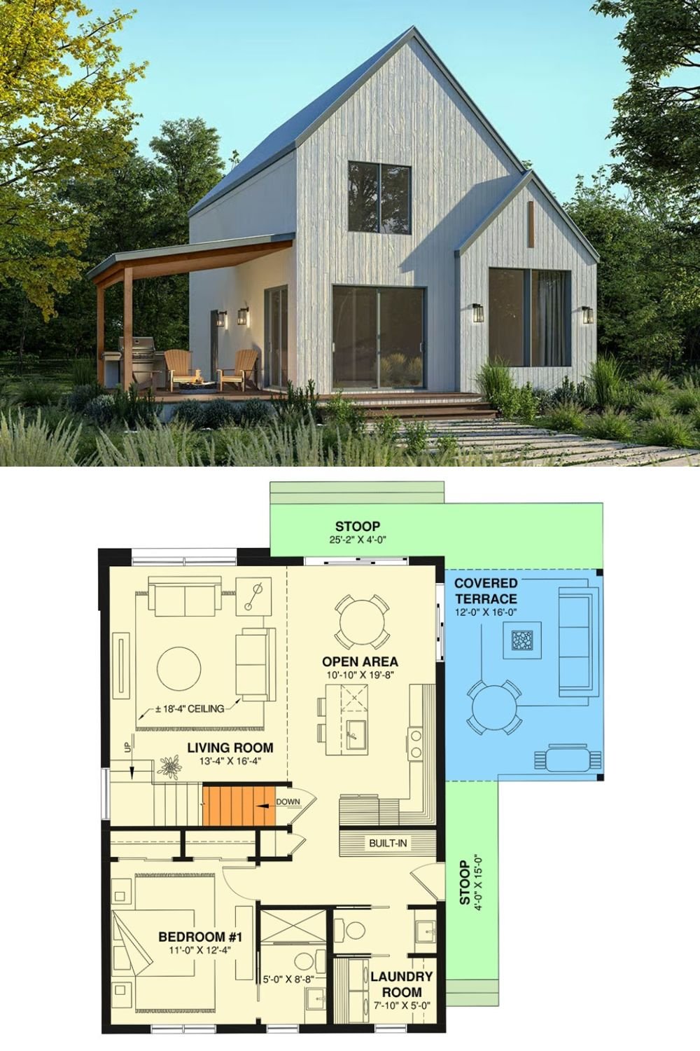 Clean lines and a modern Scandinavian cottage exterior give this 1,710-square-foot home a fresh, inviting presence. Inside, a welcoming foyer opens to a bright living room highlighted by a dramatic sloped ceiling that enhances the sense of space.