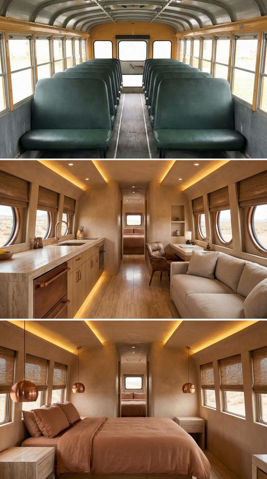 From Dated School Bus to Luxury Mobile Retreat with Warm Earth Tones