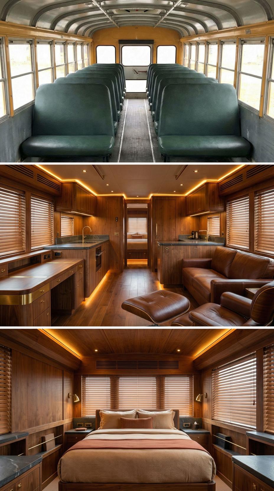 Traditional green vinyl bench seating transforms into an opulent mobile retreat featuring rich walnut paneling and sophisticated neutral tones. The conversion showcases a spacious living area with built-in storage, professional lighting design, and a separate bedroom suite. Warm wood finishes and contemporary furnishings create an upscale hospitality experience that rivals five-star accommodations while maintaining the freedom of mobile living.