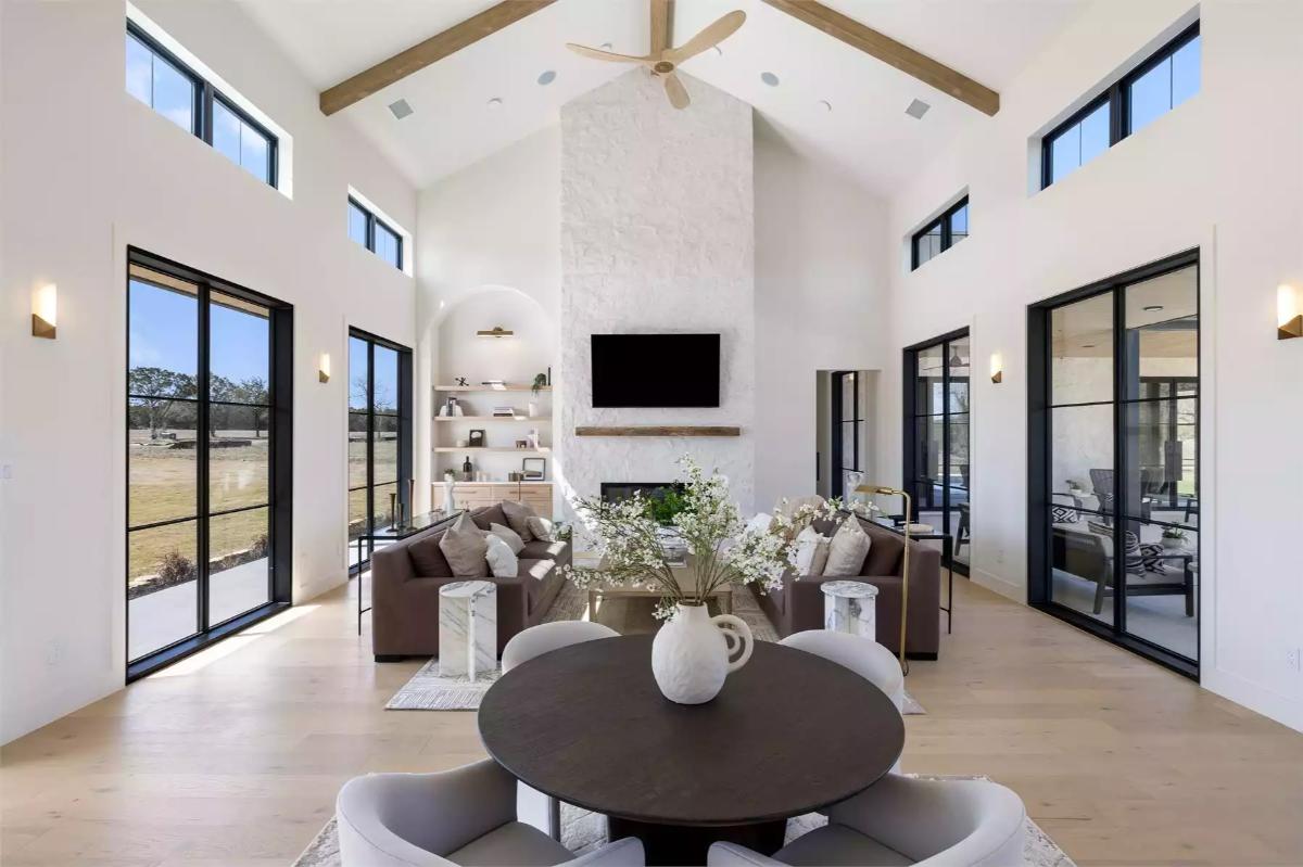 The expansive facade and courtyard-style garage create immediate curb appeal, while vaulted ceilings over the great room, kitchen, and dining area add dramatic interior volume.