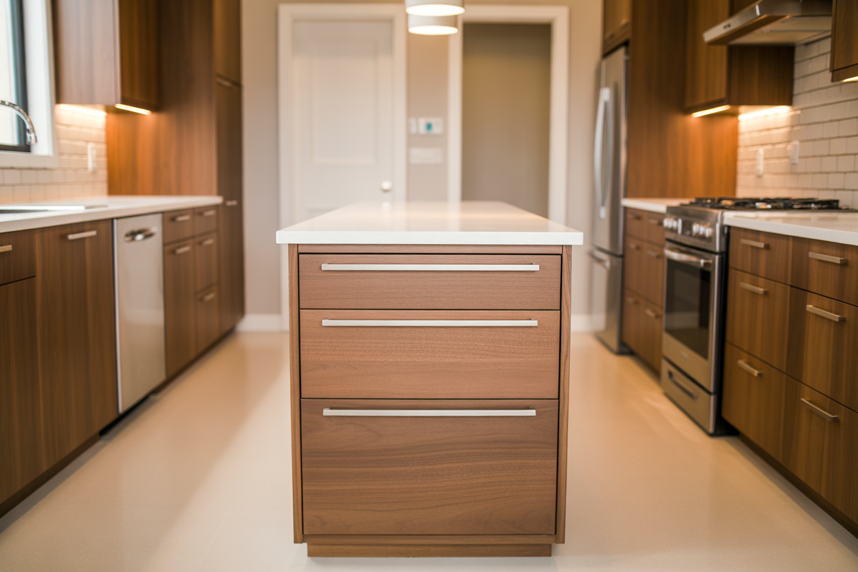 The waterfall edge creates an illusion of vertical elegance, making your narrow kitchen feel architecturally intentional rather than spatially compromised. This continuous countertop flow that cascades down both sides transforms a slim island into a sculptural centerpiece, drawing the eye downward and creating visual weight that anchors the space. The seamless construction eliminates visual clutter while delivering psychological comfort through clean geometry. Choose quartz or marble for maximum impact, as the veining continues uninterrupted from top to floor, creating what I call โvertical luxuryโ in compact environments.