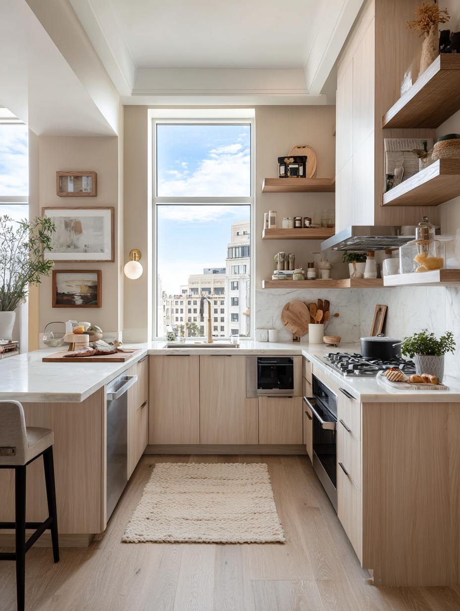 Light wood cabinetry paired with crisp white quartz countertops creates an airy foundation that makes this compact galley feel surprisingly spacious. Floating shelves showcase everyday essentials while maintaining visual flow, and the neutral palette allows natural light from the large window to bounce throughout the space. Strategic placement of plants and woven textures adds organic warmth without cluttering the streamlined design.