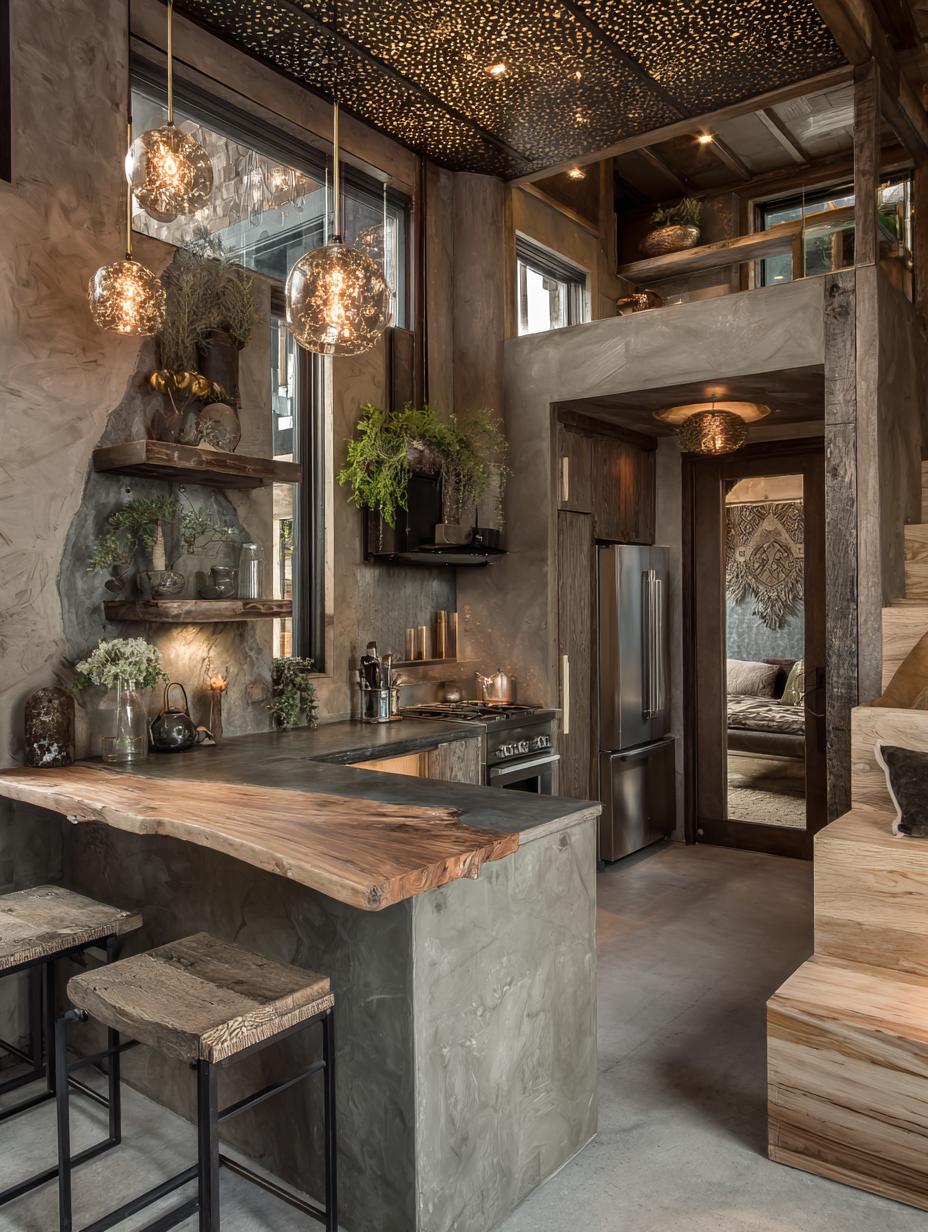 Reclaimed wood countertops paired with concrete waterfall islands maximize counter space while maintaining an organic, earthy aesthetic. Woven pendant lights cast warm ambiance throughout the vertical design, while floating shelves display curated ceramics and greenery. Dark stained cabinetry contrasts beautifully against natural stone backsplashes, creating visual depth that makes compact kitchens feel expansive and inviting.