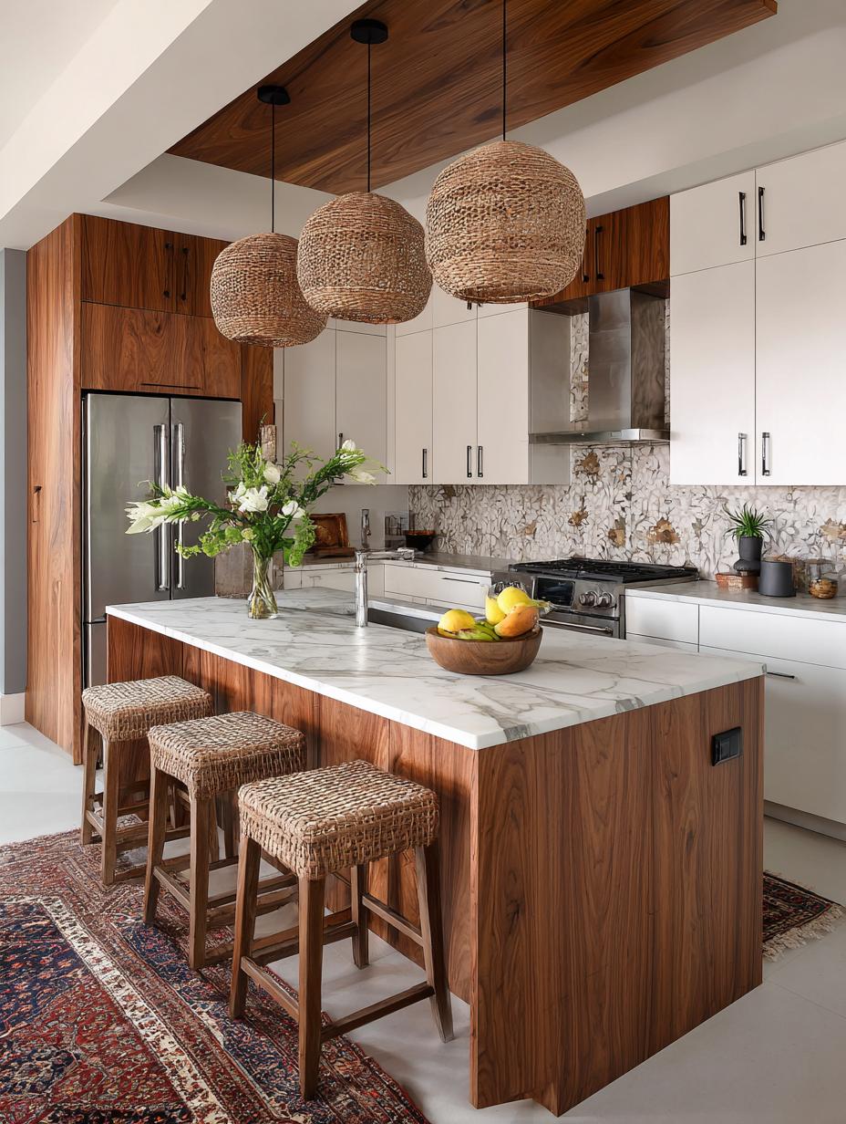 Woven rattan pendant lights create stunning visual weight above this walnut kitchen island, drawing eyes upward to expand the perceived space. White upper cabinetry balances rich wood tones while natural fiber bar stools add textural interest without visual bulk. The marble waterfall countertop reflects light beautifully, making this compact galley feel surprisingly open and airy.