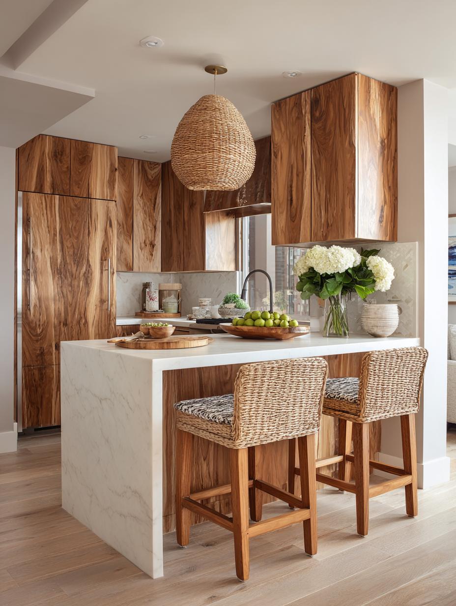 Natural walnut grain cabinets create vertical storage that draws eyes upward, making compact square footage feel surprisingly spacious. Woven rattan pendant lights cast warm ambient lighting over the marble waterfall island, while textured bar stools invite casual conversations. Under-cabinet LED strips illuminate the white stone backsplash, creating depth and preventing the perimeter from feeling closed-in despite floor-to-ceiling cabinetry.