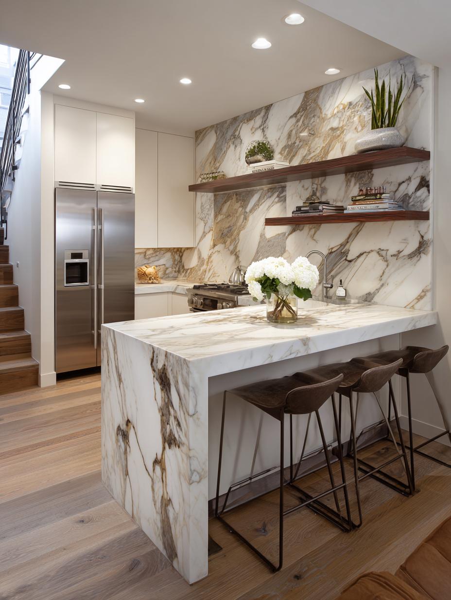 Marble Waterfall Islands That Make Small Kitchens Feel Like Luxury Retreats