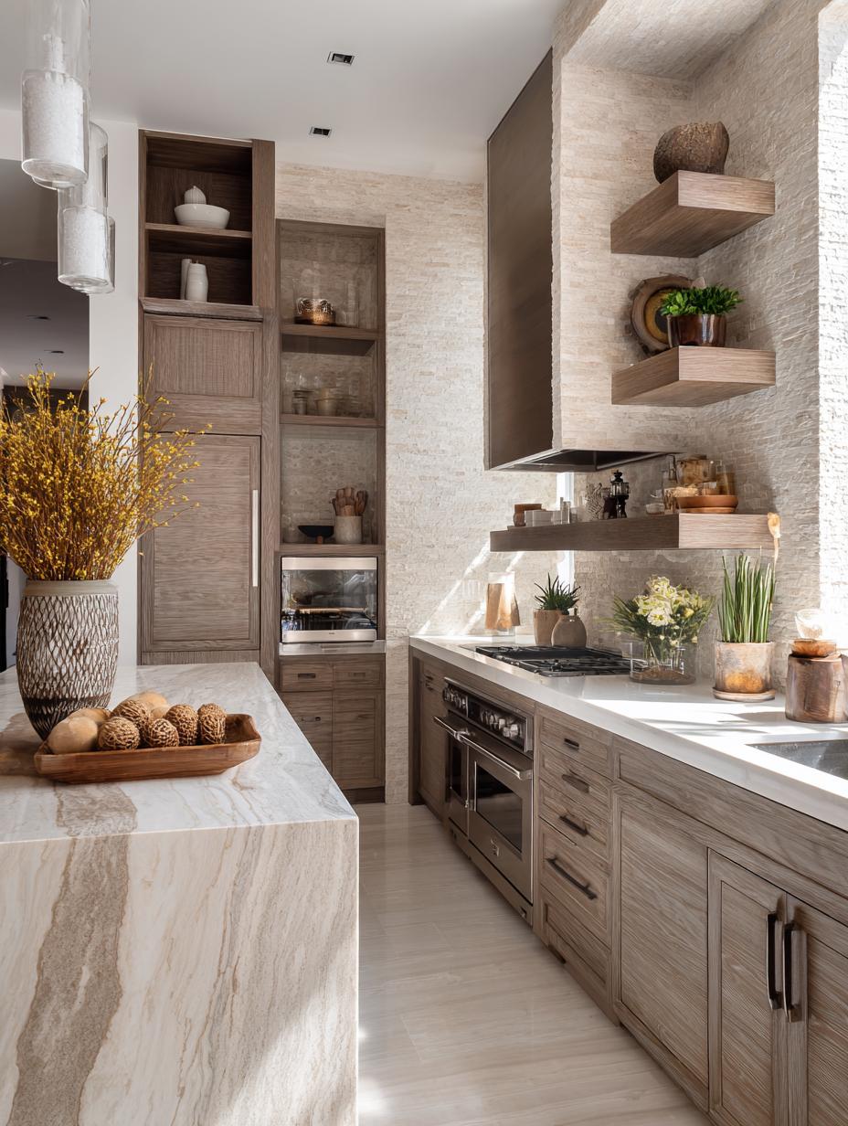 Warm walnut cabinetry creates visual continuity throughout this sophisticated space, while textured stone backsplash walls add organic depth. Floating shelves display curated ceramics and greenery, transforming functional storage into artistic vignettes. Marble waterfall countertops anchor the design with luxurious veining, while woven baskets and natural pottery introduce bohemian textures that soften the contemporary lines.