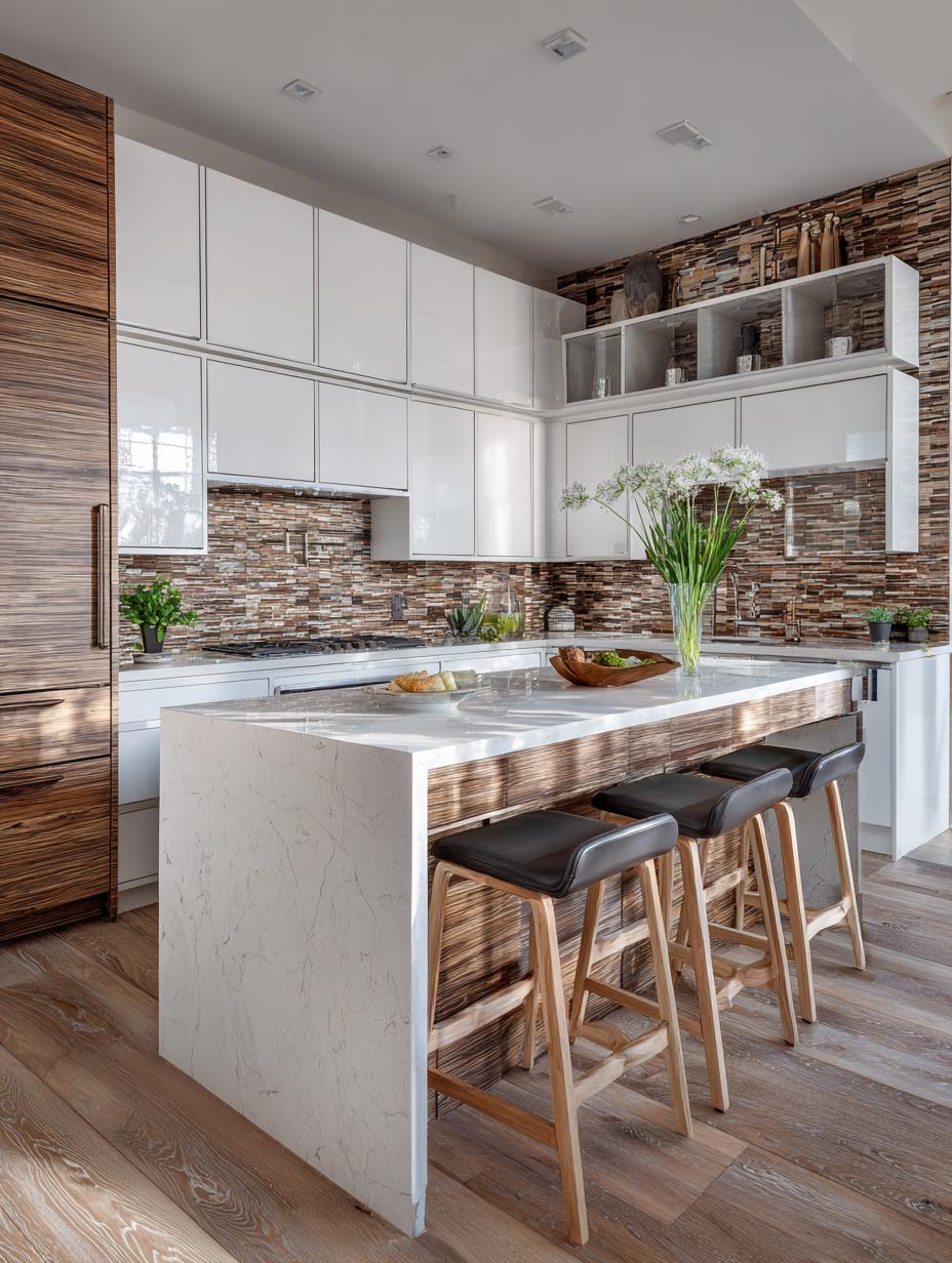 Zebra wood grain wraps around a pristine white quartz waterfall island, creating stunning visual contrast against crisp white cabinetry. Mixed-material mosaic tiles in warm browns bridge the gap between natural wood elements and modern surfaces. Four contemporary bar stools invite casual dining while recessed lighting illuminates every gleaming surface. Open shelving displays curated accessories without cluttering the streamlined aesthetic.