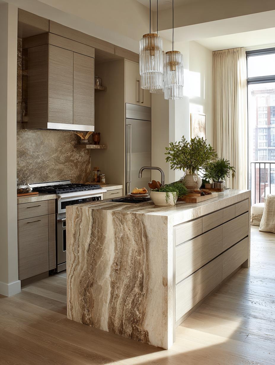 Natural Stone Waterfall Islands Create Dramatic Focal Points in Neutral Kitchens