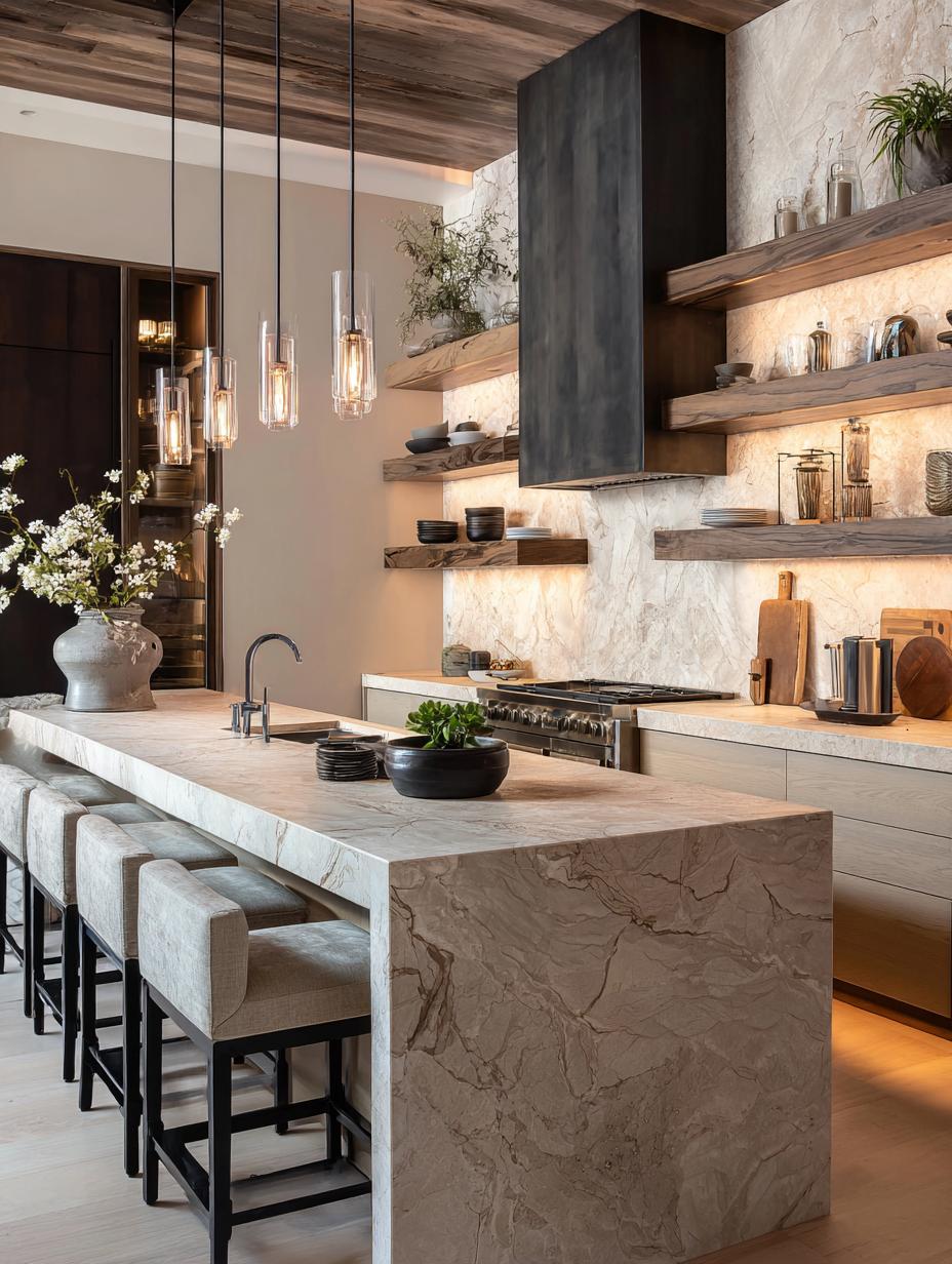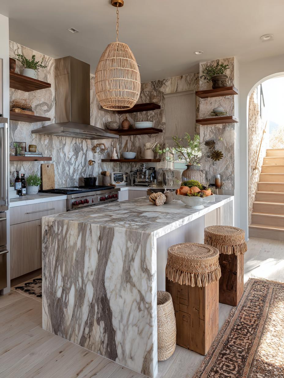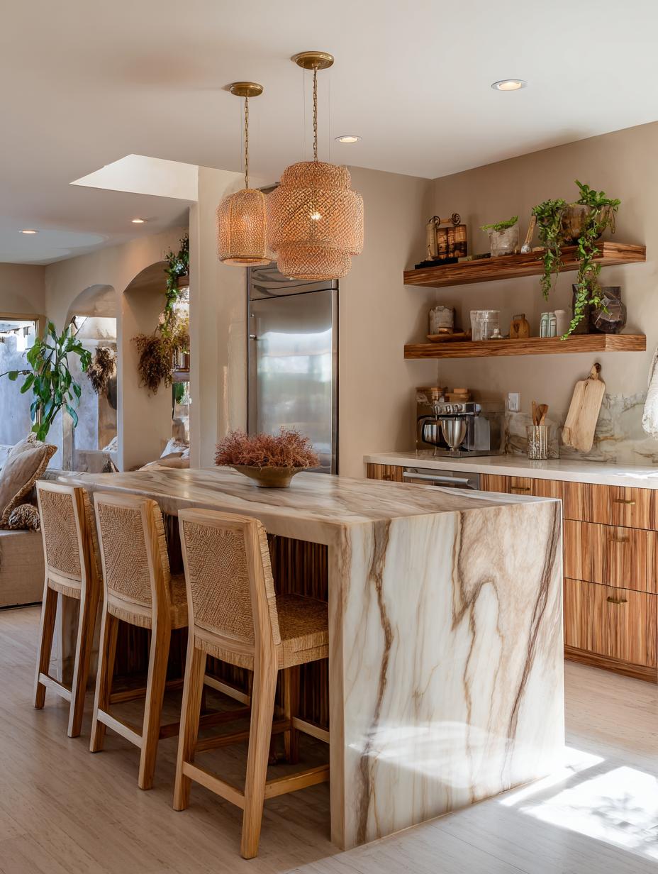 Marble Waterfall Island Creates Luxe Focal Point in Earth-Toned Boho Kitchen