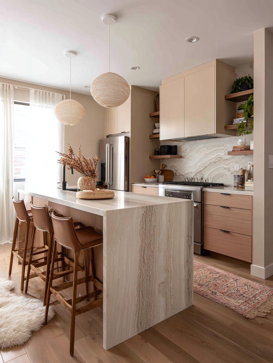 Luxe Marble Waterfall Island Creates Boho Elegance in Compact Space