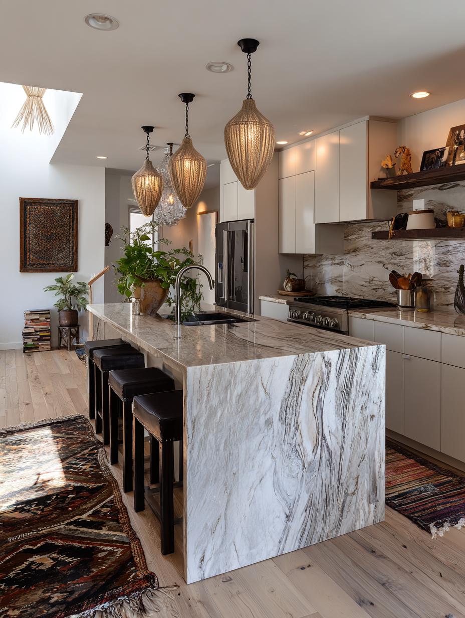 Luxe Marble Waterfall Island Creates Boho Drama in Open Layout