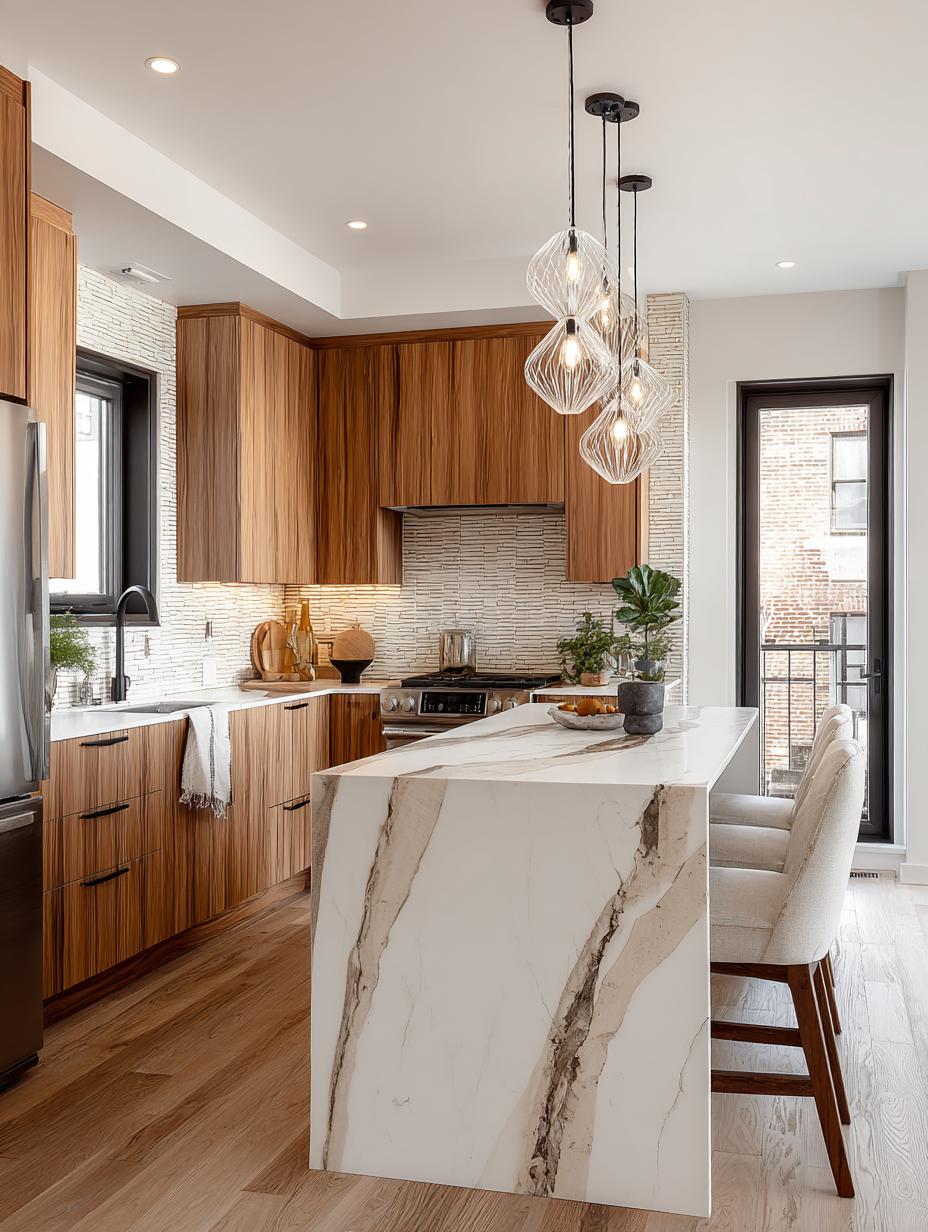 Warm Wood Cabinets Meet Marble Waterfall Islands in Perfect Boho Harmony